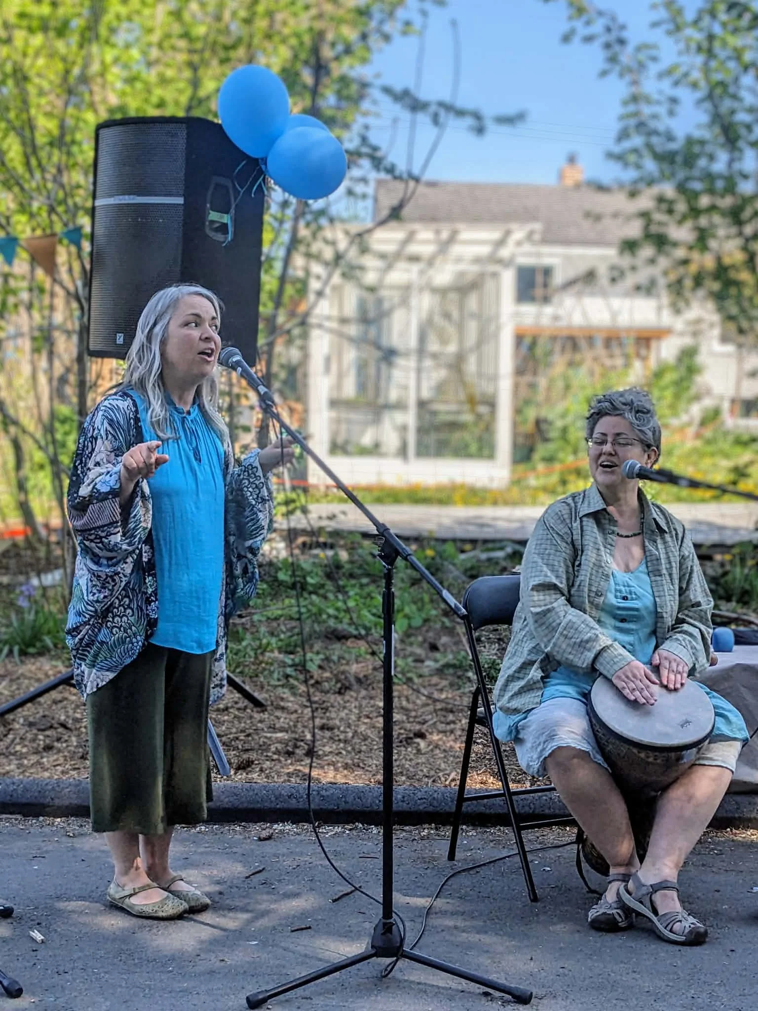 Sylvia and April leading a community singing event in summer 2025